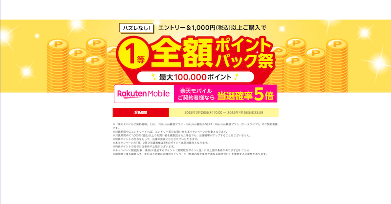 - 抽選で最大10万円分の楽天ポイントが当たる