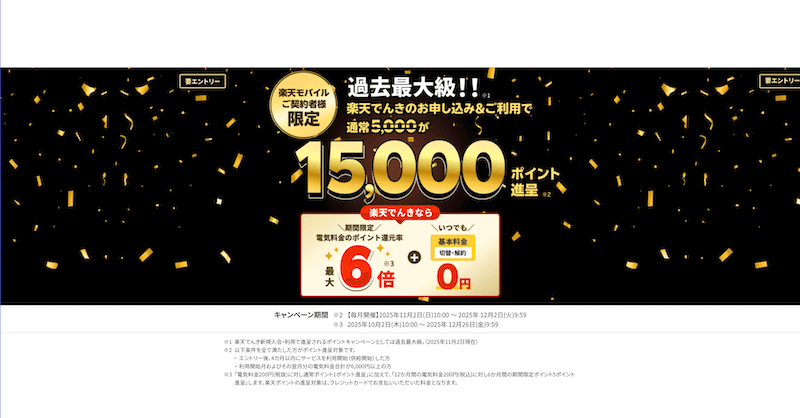 楽天モバイル契約者なら楽天でんき新規契約で最大15,000ポイントがもらえます!