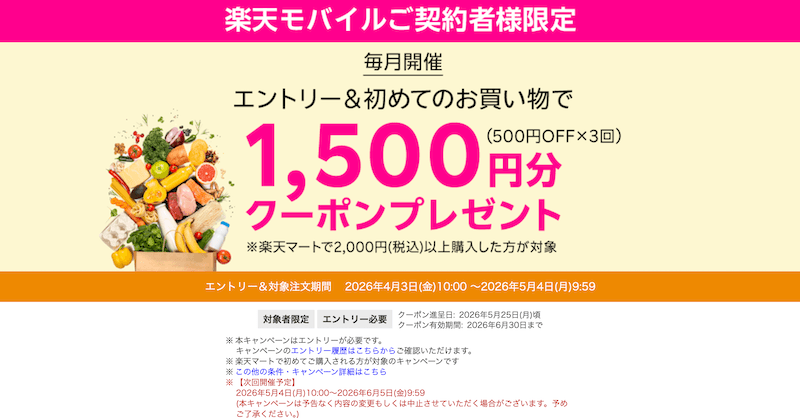 【楽天マート×楽天モバイル】契約者限定!初回購入で1,500円分クーポンがもらえるキャンペーンとは?