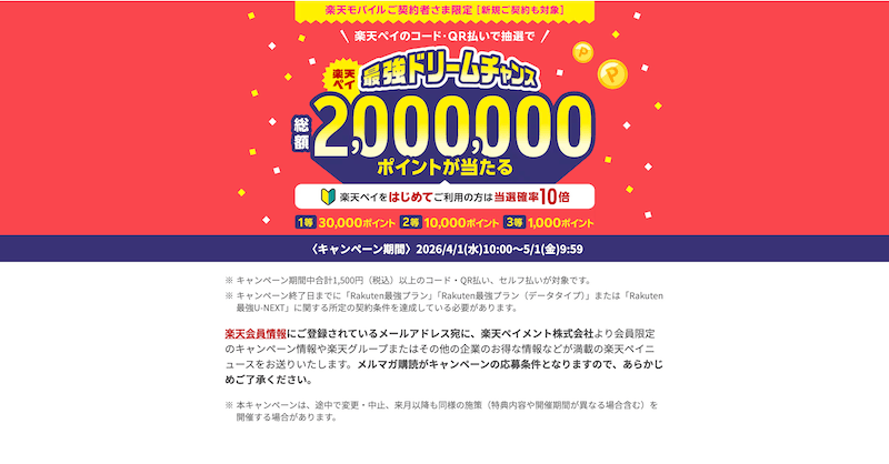 楽天モバイル×楽天ペイで200万ポイントが当たる!「最強ドリームチャンス」キャンペーン解説【2026年最新】